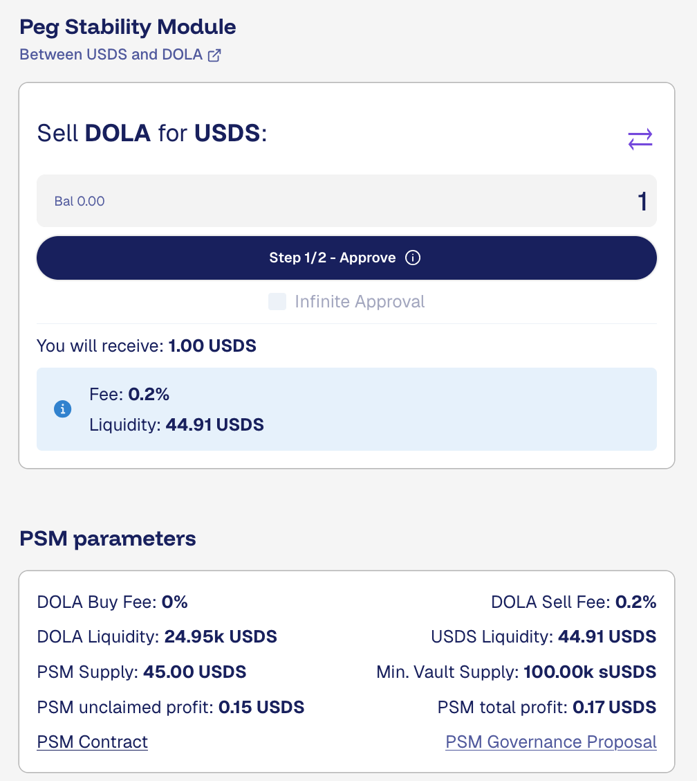 When DOLA is above its USD peg (or USDS is below DOLA’s price), you can swap USDS for DOLA 1:1.